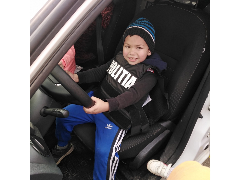 Întâlnirea polițiștilor s-a încheiat cu activități apreciate de copii: de a vedea îndeaproape autospeciala de poliție și de a proba elemente din uniforma polițiștilor, bucuria fiind vizibilă pe fețele pline de zâmbete molipsitoare.