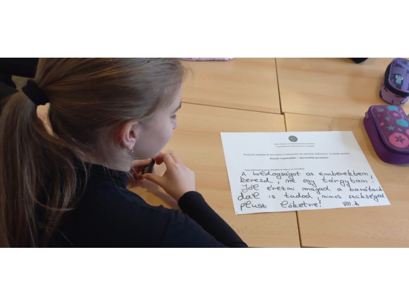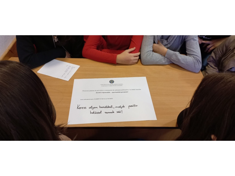 De asemenea, elevilor le-a fost lansată invitația de a participa la atelierul tematic Fii EROU în viața ta, nu VICTIMĂ! și de a realiza un mesaj ce poate fi adresat altor tineri de vârsta lor, aceștia optând să recomande alegerea unui anturaj pozitiv în viața lor.