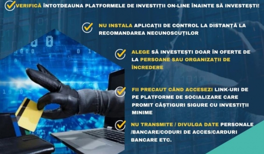 Astăzi, 21 mai, în cadrul manifestării „Săptămâna Prevenirii Criminalităţii”, cu tema „Siguranța în mediul online”, polițiștii din Compartimentul de Analiză și Prevenire a Criminalității din cadrul I.P.J. Harghita lansează Campania de Prevenire a Înșelăciunilor prin Investiții Online.