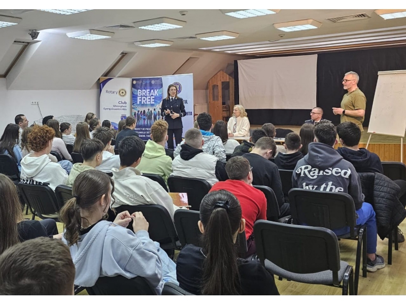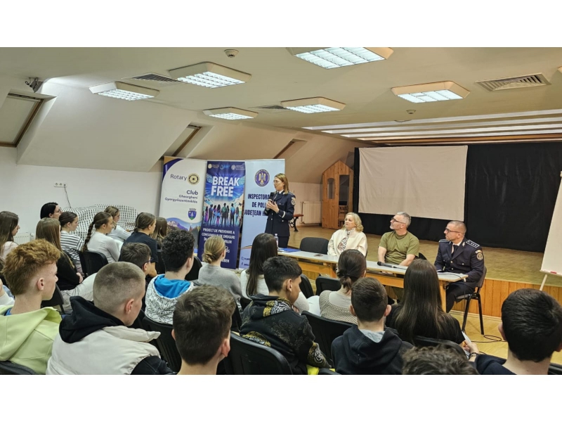 Proiectul de prevenire a consumului de droguri BREAK FREE, inițiat de Rotary Club Gheorgheni în parteneriat cu Inspectoratul de Poliție Județean Harghita prin Compartimentul de Analiză și Prevenire a Criminalității și Inspectoratul Școlar Județean Harghita, a ajuns la cea de-a doua ediție, aducând din nou în prim-plan importanța informării și prevenirii în rândul adolescenților, în contextul riscurilor tot mai frecvente legate de consumul de droguri.