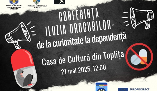 Inspectoratul de Poliție Județean Harghita, prin Compartimentul de Analiză și Prevenire a Criminalității, în colaborare cu Primăria municipiului Toplița și Asociația Teen Challenge Cluj, organizează conferința „Iluzia drogurilor – de la curiozitate la dependență”, un eveniment dedicat conștientizării pericolelor consumului de substanțe interzise și promovării prevenirii în rândul tinerilor.