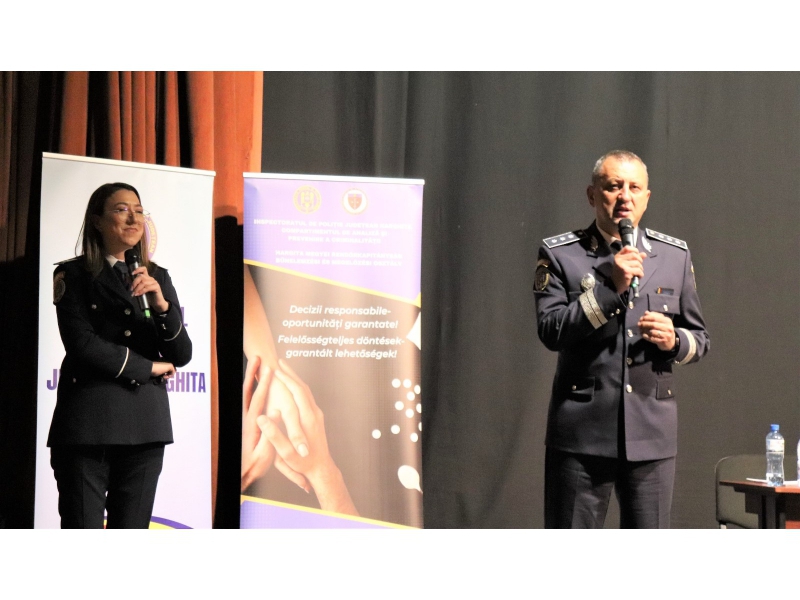 Astăzi, 22 mai - Casa de Cultură a Sindicatelor din Miercurea Ciuc a fost gazda celui de-al doilea eveniment major din cadrul proiectului județean „Decizii responsabile - oportunități garantate”, inițiat de Compartimentul de Analiză și Prevenire a Criminalității din cadrul Inspectoratului de Poliție Județean Harghita. Scopul principal al acestui eveniment a fost de a crește conștientizarea tinerilor cu privire la consecințele grave ale consumului de droguri.