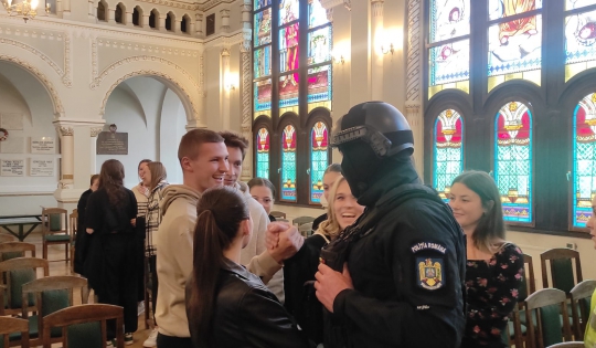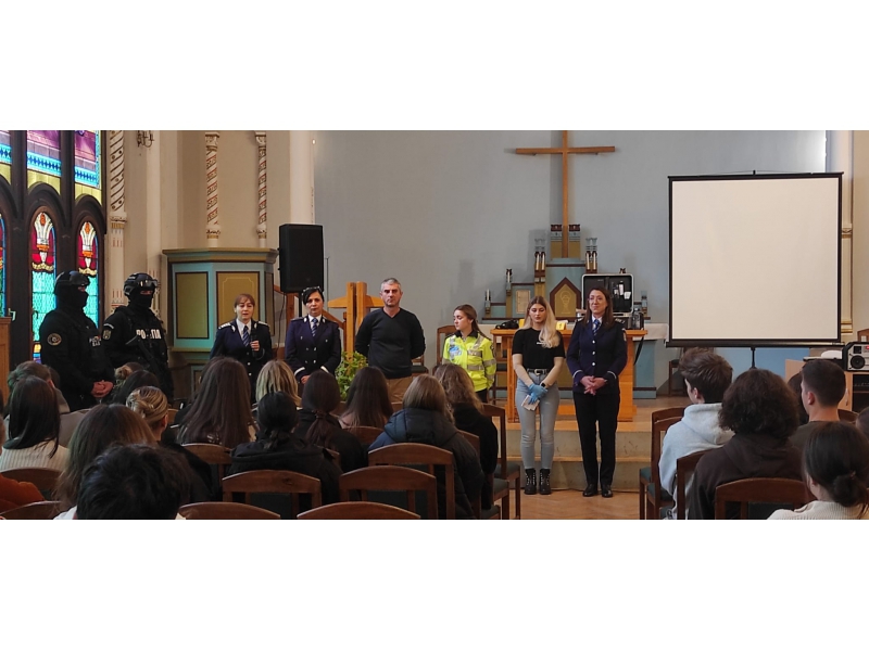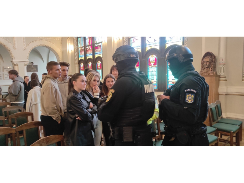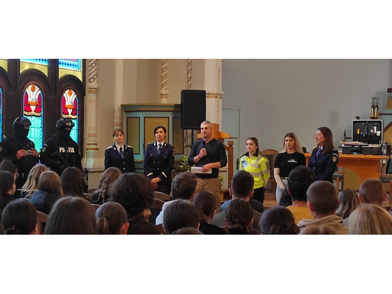 Vineri, 27 otombrie 2023, începând cu ora 10:40 o echipă, formată din polițiști de mai multe structuri ale Inspectoratului de Poliție Județean Harghita, respectiv Serviciul Rutier, Compartimentul de Proximitate a Poliției Municipiului Miercurea-Ciuc, Serviciul Criminalistic, Biroul Pregătire Profesională, Biroul Siguranță Școlară, Compartimentul de Prevenire, Serviciul pentru Acțiuni Speciale și purtătorul de cuvânt, a avut o intrevedere cu elevii din clasele terminale ale Colegiului Național “Marton Aron” din Miercurea-Ciuc.